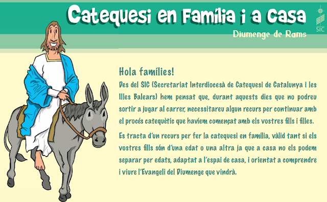 El proper diumenge 5 d'abril és el Diumenge de Rams i comença la Setmana Santa. El Secretariat Interdiocesà de Catequesi ha elaborat una fitxa que podem treballar a casa que serveix per llegir, resar, cantar i fer activitats...